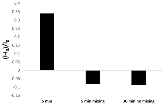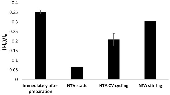Another issue was verifying the possibility of aptamer-based layer regeneration, and for that purpose, the electrodes were subjected to 1 mM NTA solution and incubated for 5 min at static and stirring conditions and cyclic voltammetry cycling between potentials of −0.6 to 0.2 (10 cycles) at 0.3 V·s−1 scan rate was performed. It can be seen in Figure 11 that each method of bioreceptor layer regeneration led to a decrease in response, with the most significant observed for incubation in NTA solution at static conditions. Five minute incubation in 1 mM NTA at stirring conditions allowed the preservation of 87% of the initial aptasensor response, whereas electrochemical scanning caused a 40% drop in response. Therefore, it is possible to regenerate the aptamer-based layer partially. However, it should also be emphasized that screen-printed miniaturized sensors are generally considered single-use transducers.