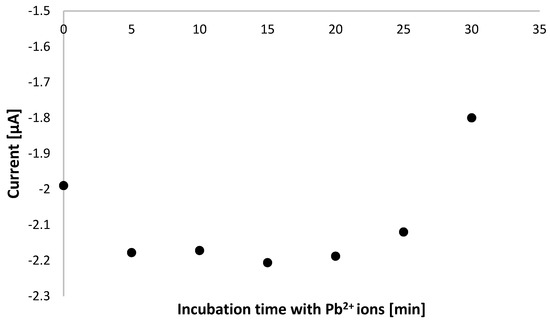 Initially, the conditions for executing voltammetric measurements to evidence the binding between aptamer-based layer with lead cations were selected and referred to incubation time of modified electrode with methylene blue solution spiked with Pb2+ ions. As can be seen in Figure 4, there is a substantial difference between responses recorded after 5 min incubation with 100 nM lead ions at static conditions, which reaches 0.35, whereas both at stirring conditions after 5 min and 30 min incubation at static conditions, the response does not exceed −0.1 and evidence a minor current drop after incubation with lead ions. In the case of stirring conditions, this could be justified by the partial deterioration of the aptamer-based layer and the possibility of pinholes in the receptor layer available for the adsorption of methylene blue molecules. Though lead cations interaction with remaining aptamer strands can still happen, the alteration of receptor layer properties results in a negligible current change. When longer than 30 min, incubation time at static conditions was tested, and similar behavior in terms of aptasensor response was evidenced, which can also indicate the possible damage of the aptamer layer upon prolonged contact with the target analyte or, even more likely, a change of the composition of the receptor layer. The latter might be caused by distinct conformations of aptamer strands forming the receptor layer and indicates the dynamics of the aptamer-based layer. The possibility of reorganization from intrastrand to interstrand G-quadruplexes cannot also be excluded. It was shown that Pb2+-induced folding of TBA into a G-quadruplex occurs probably through the rapid formation of an intermediate Pb2+-TBA complex that then isomerizes to the fully folded structure [67]. This might be why a more pronounced response was recorded after 5 min incubation with lead ions after a 30-min period. Based on such reports, we also aimed to verify the effect on aptamer-based layer incubation time with lead ions, and it can be observed in Figure 5 that a signal increase is visible after subsequent incubations in lead nitrate solution containing MB redox indicator, which eventually decreases after 30 min incubation. This might result from a combination of factors, including various conformations of aptamer strands, their dynamics, and the possibility of a change from intrastrand to interstrand G-quadruplexes. Based on such results, a shorter incubation with lead ions is more favorable regarding the proposed aptasensor’s sensitivity. As 5 min static incubation with lead cations solution provided the most significant response consistent with the aptasensor behavior observed for macroelectrode-based sensors, such incubation period at static conditions were chosen for further research.