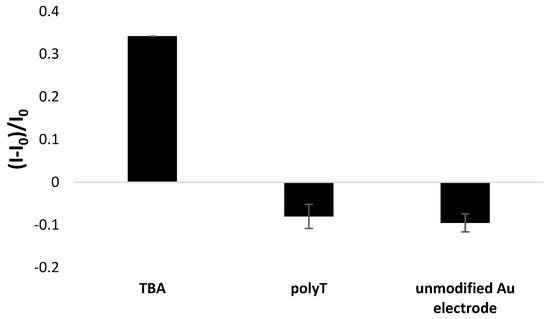Importantly, the presence of guanine moieties in the aptamer sequence resulted in a significant increase in aptasensor response when compared with the response of electrode modified with reference ssDNA probe containing solely thymine nucleotides. As seen in Figure 6, a decrease in polyT-modified electrode response was recorded after incubation with 100 nM Pb2+, which confirms the exceptional role of guanine nucleobases and the possibility of the formation of G-quadruplex structure when Pb2+ ions are present. Moreover, the application of polyT sequence as a receptor layer led to a response almost equal to that of an unmodified gold electrode. This depicts the necessity of the application of a G-rich aptamer strand to obtain a response of substantial intensity towards lead ions.