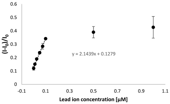 It should be noted that the obtained range of linear response covers both the concentrations below and above the maximum allowed level set for lead ions, according to the US EPA [43,44]. The miniaturized system also provided the possibility of lead ions detection lower than obtained when applying gold disk macroelectrodes, where the range of linear response was from 0.05 to 1 µM [42]. This implies better conditions in the case of miniaturized systems for distinguishing lead ion concentrations that are harmful to human beings and confirms the improvement of aptamer-based biosensor features for lead ion analysis. It should also be emphasized that a minor increase in aptasensor response for a concentration between 100 nM and 1 µM shows its applicability within the nanomolar range (<100 nM) of lead ions concentration.