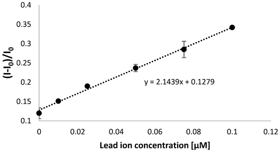 where I0 was cathodic current recorded in 50 µM methylene blue (in 50 mM Tris-HCl, pH 4.0) before and I recorded in 50 µM methylene blue in 50 mM Tris-HCl, pH 4.0 after electrode incubation with lead ions (in 50 µM methylene blue in 50 mM Tris-HCl, pH 4.0).