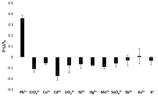 Then, the selectivity of TBA—the TBA-based layer—was studied by comparison of responses at 72 nM concentration, which refers to the maximum acceptable level for lead ions. As seen in Figure 9, in the case of all the analyzed ions, a different mechanism of current response was observed than for the target analyte. Namely, a current decrease was observed after incubation for all the interfering ions. The reason for that could be the exceptional feature of lead ions to stabilize the G-quadruplex structure, causing a sensing layer conformation change and a rearrangement to a more packed form. It could be expected that this would instead cause a repulsion of methylene blue as the overall aptamer layer charge diminished due to Pb2+ ions binding to aptamer strands. On the contrary, the formation of G-quadruplexes enabled the exposure of guanine moieties in the outer part of the monolayer. Since there have been several indications of the high affinity of guanines towards methylene blue [46], the accumulation of MB molecules in close vicinity to the electrode surface justifies the increase in the current signal after incubation with lead ions. Such a mechanism did not occur when aptamer-modified electrode was incubated with other tested ions. The current decrease was the most significant in the case of cadmium ions, which can be explained by the possibility of their interaction not only with negatively charged phosphate moieties and oxygen and nitrogen atoms present in nucleotides forming the aptamer strand. Nevertheless, it should be noted that the interaction between interfering ions and the aptamer-based layer was not significant, as the repulsion of methylene blue was minor and led to a smaller current change. Importantly, MB current decrease was observed not only for mono-, di- and trivalent metal cations but also in the case of chromate and selenate anions. Such behavior indicates that the binding of interfering species with the TBA-based layer is substantially weaker than Pb2+–TBA interaction. Lastly, the aptasensor response decrease was observed for potassium ions, which are also known to exhibit the ability to stabilize G-quadruplex structures [38]. A distinct tendency of response might be caused most likely by the pH value of solutions used for electrochemical studies. In the case of all experiments, including selectivity studies, mild acidic (pH 4.0) conditions were applied for all tested ions. At higher pH values, lead ions would possibly be complexed by hydroxyl groups, which could affect their affinity towards the aptamer-based layer. On the contrary, potassium ions tend to interact with the TBA sequence in a different manner in mild acidic environments than in conditions like physiological ones, as shown in other studies [38]. Hence, the high selectivity of the TBA/MCH receptor layer towards lead ions was confirmed.