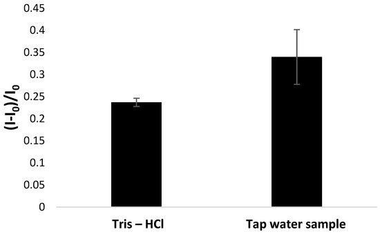 One of the key features of the practical use of developed biosensors is their feasibility for analyzing real samples. As the development of the proposed aptasensor aimed to detect lead ions in water samples, we applied it to analyze tap water samples spiked with lead nitrate at 50 nM concentration. The whole measurement procedure was consistent with the one utilized for studies on laboratory samples, and aptasensor responses were compared after incubation with Pb2+ cation solutions prepared in 50 mM Tris-HCl (pH 4.0, containing 50 µM methylene blue redox indicator) and in tap water. In the latter case, a defined amount of lead nitrate was dissolved in tap water to receive 10 mM concentration, which was further diluted in 50 mM Tris-HCl (pH 4.0, containing 50 µM methylene blue redox indicator) to 50 nM concentration. It was expected that the biosensor response for real samples might be affected because of direct contact with a more complex matrix of tap water in comparison to laboratory samples.