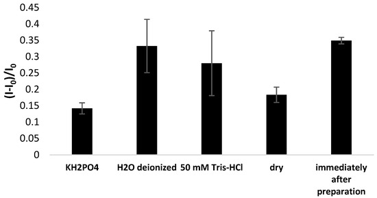 The stability of aptamer-based layers is another essential feature concerning the commercial application of the proposed platform and the necessity of transducer storage after fabricating the receptor layers. Hence, the aptasensor response was compared immediately after receptor layer preparation and after 72 h storage at dry conditions in immobilization buffer (1 M KH2PO4), 50 mM Tris-HCl, and deionized water at 4 °C. It can be seen in Figure 12 that none of the storage methods allowed the initial response to be preserved, and the most significant signal drop was recorded when electrodes were kept in 1 M KH2PO4 or dry. This indicates a substantial loss of binding properties of the aptamer-based layer and a high likelihood of aptamer strand degradation or detachment from the gold surface. A less pronounced signal decrease was observed when miniaturized electrodes were kept in Tris-HCl (80% of initial response) and deionized water (95% of initial aptasensor response), which suggests that fewer aptamer strands were separated from the gold surface. Therefore, both methods could be considered for application for aptamer-modified electrode storage.