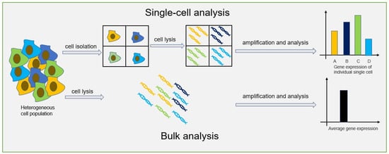 It has been well-established that heterogeneity exists among cells. Traditional bulk analysis methods obtain the average value of cells, which could not clearly explain the behavior of individual cells. Compared to a bulk analysis, single-cell analysis can obtain data at single-cell level, helping researchers to better understand cellular heterogeneity, biological functions and various diseases mechanisms. The difference between single-cell analysis and bulk analysis is shown in Figure 1.