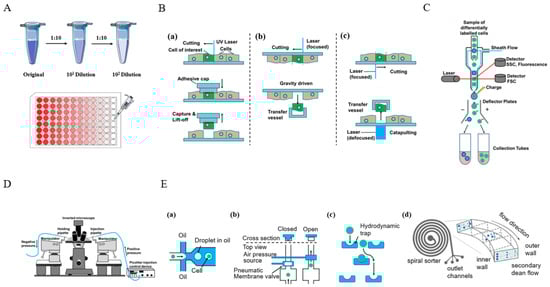 The five most-used single-cell isolation methods. (A) Schematic overview of limited serial dilution. (B) Schematic overview of laser capture microdissection (LCM) methods. (a) Contact-based via adhesive tapes. (b) Cutting with a focused laser followed by capture with a vessel. (c) Cutting with a focused laser followed by pressure catapulting with a defocused laser pulse. (C) Schematic overview of fluorescence-activated cell sorting (FACS). (D) Schematic overview of micromanipulator. (E) Schematic overview of different microfluidic methods for single-cell isolation. (a) Droplet-in-oil-based isolation. (b) Pneumatic membrane valving- based isolation. (c) Hydrodynamic cell traps-based isolation. (d) Dean flow-based isolation. Reprinted from ref. [].