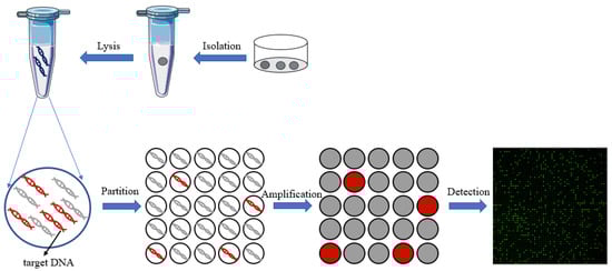 In recent years, with the development of microfluidic technology, digital PCR has been widely used in gene mutation detection [], copy number variation detection [], virus microbial detection [], genetically modified organisms’ detection [,], and other fields []. Compared to qPCR, digital PCR can achieve absolute quantification without standard curves, and it is an end-point-detection method which can increase detection sensitivity compared to qPCR reaction inhibition variations. On the other hand, the reaction units of dPCR are nanoliter chambers and droplets, which will help increase primer relative concentration to capture the low-abundance targets. Thus, dPCR technology can reduce the expression bias of different abundance targets in qPCR. All of these advantages make dPCR suitable for single-cell analysis. The principle of digital PCR for single-cell analysis is shown in Figure 3.
