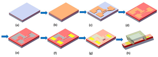 Schematic diagram of the fabricating flowchart of the NBFET device. (a) SOI wafer as the substrate. (b) SiO2/Si3N4 stack film deposition. (c) Active region definition. (d) Thick SiO2 film deposition. (e) SiO2/Si3N4 stack film removal. (f) AlSiCu electrode pad deposition and definition. (g) Si3N4/TEOS-oxide film deposition and etching-back to expose the nanobelt. (h) Microfluidic channel installation for bio-sensing.