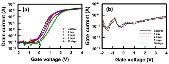 Given these intricate challenges, it was imperative to conduct a time-dependent stability assessment of the NBFET device when immersed in a buffer solution. This evaluation allowed us to gain insights into how the device’s performance evolves over time in real conditions. Illustrated in Figure 5a are the ID–VG curves of the NBFET biosensor immersed in PBS for varying durations. Evidently, the curves gradually shift right with increasing immersion time. Notably, the SS experienced a slight change after 5 days, becoming significantly smaller after 10 days of immersion. Figure 5b displays the IG–VG curves of the devices immersed in the PBS. The gate leakage current remained consistently at the same level, indicating that the gate leakage was not the primary factor contributing to the device degradation over the 0- to 10-day immersion period. This observation underscores the impact of the buffer solution on the electrical characteristics of the NBFET device, revealing a heightened degradation as the immersion duration extends. These findings emphasize the necessity of understanding and addressing the time-dependent stability challenges in biosensor applications.