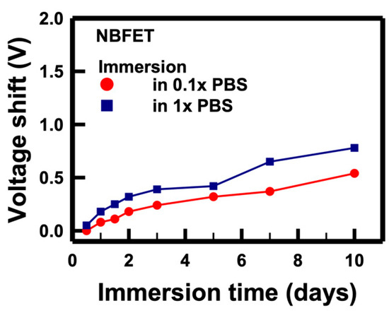 The results showed that, regardless of whether the devices were immersed in 1× or 0.1× solutions, the voltage shifts increased with prolonged immersion, aligning with the trends observed in Figure 5. Remarkably, a higher magnitude of voltage shifts was observed in the 1× PBS sample compared to that in the 0.1× PBS. This discrepancy can be attributed to the tenfold higher ion concentration in the 1× PBS compared to that in the 0.1× PBS. From this, we infer that the primary cause of NBFET degradation is the penetration of ions into the nanobelt structure during the immersion period. This understanding sheds light on the critical role of ion diffusion in the observed degradation of NBFET devices immersed in buffer solutions, further emphasizing the importance of addressing this challenge for enhanced device reliability and longevity.