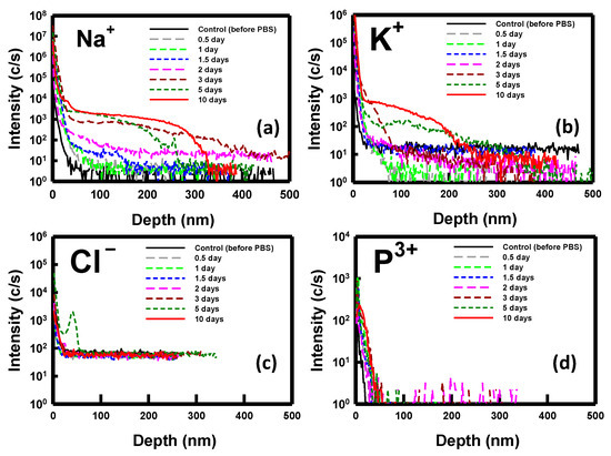 SIMS depth profile of the ions for the sample immersed in the PBS solution over various durations: (a) sodium ions, (b) potassium ions, (c) chlorine ions, and (d) phosphorus ions.