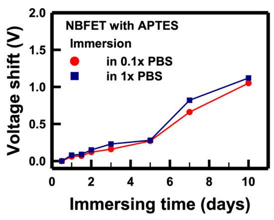 The electrical performance of the NBFET biosensors featuring APTES coating on the nanobelt surface was also assessed to evaluate their effectiveness following PBS immersion. In Figure 8, the voltage shifts of the APTES-functionalized NBFET biosensors immersed in 1× and 0.1× PBS are illustrated. Notably, for samples subjected to less than 5 days of immersion, the APTES-functionalized NBFET devices exhibited smaller voltage shifts than their uncoated counterparts. However, the voltage shifts of the APTES-functionalized NBFET devices showed a significant increase during immersion from 7 to 10 days. Furthermore, the discrepancy in voltage shifts between 1× and 0.1× PBS conditions was found to be smaller for the APTES-functionalized samples compared to the uncoated ones. This observation leads us to conclude that, within the initial 5 days of immersion, ion penetration may influence the performance of NBFET devices. Beyond this period, however, ion penetration is not the predominant mechanism causing voltage shifts in the APTES-coated samples. These findings underscore the temporal dynamics of APTES-coating effectiveness in mitigating ion-induced effects on NBFET device performance.