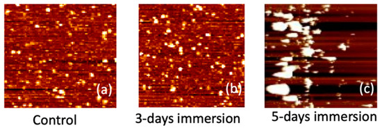 Surface AFM images of the APTES-coated samples for (a) control (0 days), (b) 3 days, and (c) 5 days of PBS immersion.