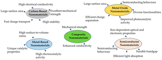 Nanomaterials have ushered in a revolutionary era in sensor applications, harnessing their distinctive attributes, such as a high surface-to-volume ratio [22], adjustable optical, electrical, and magnetic characteristics, as well as heightened sensitivity and selectivity (Figure 3). Recent advancements in electrochemical sensor platforms are increasingly centred around the utilization of diverse nanomaterials, including MXene [23], carbon nanomaterials, metal oxide nanomaterials [15,24,25], metal nanoparticles [22], biomaterials [14], polymers [26], and hybrid materials [27]. These nanomaterials play a pivotal role in significantly enhancing the sensitivity and performance of electrochemical sensors across a wide array of domains, spanning environmental monitoring to healthcare applications. Their unique properties position them as invaluable tools for precise and efficient analysis, thus contributing substantially to various scientific and technological advancements.