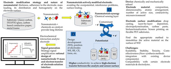 In the electrochemical detection of environmental contaminants of concern (CECs), researchers employ various nanomaterials, such as nanoparticles, nanowires, graphene, and nanotubes to modify electrodes, including Glassy Carbon Electrode (GCE), Gold Electrodes, and Diamond-like Carbon Electrodes, in a three-electrode setup (working electrodes, reference electrodes, and counter electrodes) [28,66]. Surface modifications on working electrodes enable selective detection of specific analytes in electrochemical sensing systems [21].