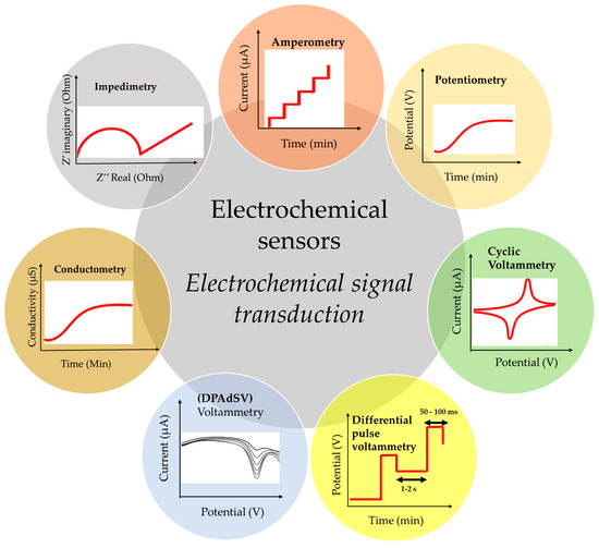 In the pursuit of identifying and quantifying water and air pollutants, various sensors come into play (refer to Table 2). Notably, electrochemical sensors have seen significant development in recent years, particularly for the detection of heavy metals. Figure 6 provides a schematic representation of the detection methods employed by these sensors. This literature review highlights the prevalence of voltametric detection methods, with a focus on techniques such as differential pulse adsorptive stripping voltammetry (DPAdSV), differential pulse voltammetry (DPV), direct linear sweep voltammetry (LSV), and amperometry for the detection of heavy metals in wastewater (as detailed in Table 3). These electrochemical methods offer effective means of identifying and quantifying heavy metal pollutants.