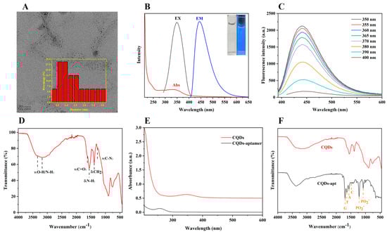 (A) TEM image, inset shows the particle size distribution of CQDs; (B) UV−vis absorption (Abs), excitation (EX), and emission (EM) spectra of CQDs, and the inset shows the photographs of CQDs in daylight (left) and 365 nm ultra−violet light (right); (C) fluorescence spectra of the CQDs at different excitation wavelengths; (D) FT−IR spectra of CQDs; (E) UV−vis absorption and (F) FT−IR spectra of CQDs and CQDs−apt.