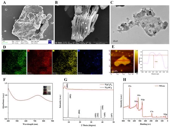 The morphology characterization of Ti3AlC2 and Ti3C2Tx flakes was obtained by scanning electron microscopy (SEM), revealing the bulky layered MAX precursor (Figure 2A) and the loosely stacked structure of MXenes (Figure 2B). Subsequently, the HR−TEM image of synthesized Ti3C2Tx flakes was obtained with a flat surface and monodisperse morphology, as depicted in Figure 2C, suggesting that monolayers or several layers of Ti3C2Tx flakes were successfully synthesized. Furthermore, the EDS of Ti3C2Tx flakes displayed in Figure 2D demonstrated that Ti, C, O, and F elements were uniformly distributed in Ti3C2Tx flakes, while the Al elements were not detected [40]. AFM characterizations proved that the average thickness of Ti3C2Tx flakes was approximately 2.0 nm (Figure 2E).