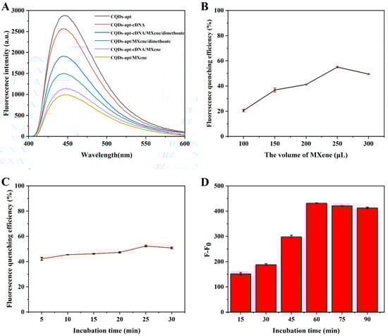 (A) Fluorescence spectra of CQDs−apt, CQDs−apt−cDNA, CQDs−apt/MXene, CQDs−apt−cDNA/MXene, CQDs-apt/MXene/dimethoate, and CQDs−apt−cDNA/MXene/dimethoate; (B) fluorescence quenching efficiency of CQDs−apt−cDNA combined with different volumes of MXene; (C) fluorescence quenching efficiency of CQDs−apt−cDNA under different hybridization times with 250 μL of MXene; and (D) relative fluorescence intensities (F−F0) of aptasensor when CQDs-apt-cDNA was incubated with dimethoate for different times. F and F0 are the fluorescence intensities of the aptasensor with 10−8 M dimethoate and without dimethoate.