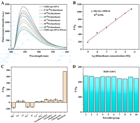 (A) Fluorescence spectra of aptasensor with dimethoate concentrations ranging from 1 × 10−9 to 5 × 10−5 M; (B) linear relationship between F−F0 and the logarithmic dimethoate concentrations; (C) the fluorescent intensities of aptasensor with 10−5 M interferences and 10−8 M dimethoate; and (D) F−F0 of 10 parallel samples with 10−8 M dimethoate.