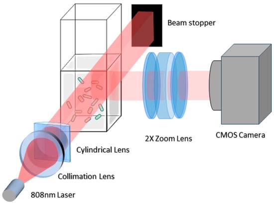 The LVM setup was composed of a 1 W, 808 nm multimode diode laser (L808P1000MM, Thorlabs Inc., Newton, NJ, USA) with a collimation lens and a cylindrical lens (Thorlabs Inc., Newton, NJ, USA) to focus the laser beam into a light slab through the sample. Side scattering images were recorded by a CMOS camera (Flea3 FL3-U3-13S2M, Point Gray Research Inc., Richmond, BC, Canada) for 30 s at 800 × 600-pixel resolution, 40 fps, and 2× magnification through a variable zoom lens (NAVITAR 12×, Navitar, New York, NY, USA) placed at a 90° angle to the laser light beam. The image volume (1.81 μL) was determined by the size of the light slab that illuminated the sample and by the viewing size and focal depth of the optics (1.85 mm × 1.4 mm × 0.7 mm).
