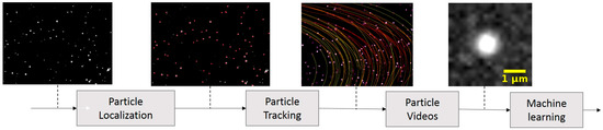 The algorithm developed for our study comprised several steps, as depicted in Figure 2. The process began with the LVM video undergoing a background subtraction process, where the minimum value for each pixel was computed over intervals of 600 frames. The LVM video contained sequential images of different particles to include polystyrene beads, bacteria, and urine particles. In this paper, we classify urine particles as small amounts of tissue, protein aggregation, blood and skin cells, and amorphous crystals typically found in healthy patients’ urine. The following step involved a particle localization algorithm that identified the centroids of these particles. Subsequently, these centroids were tracked across video frames using our tracking algorithm. This tracking process resulted in the creation of new videos featuring single particles, as illustrated in Figure 2. These single-particle videos were then utilized in the machine learning algorithm for two primary purposes: training the model and classifying the particles. To improve the specificity of our method in detecting E. coli, we designed binary models that have the potential to differentiate E. coli from both polystyrene beads and urine particles.