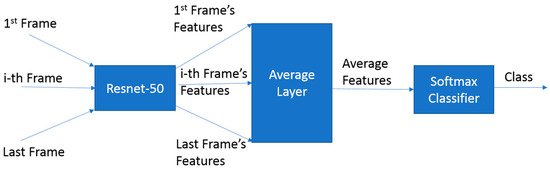 In contrast, our deep learning approach utilized advanced neural network architectures for automatic feature extraction. Initially, we employed a CNN-LSTM network [33], combining a convolutional neural network (CNN) for spatial feature extraction and long short-term memory (LSTM) neural network for temporal features, enhanced with an attention mechanism [34] to encourage the model to utilize features from various points in the time series. However, due to overfitting issues with this model, we adopted an alternative approach inspired by the Youtube-8M benchmark [35]. This second model, CNN with feature averages (CNNFA), averages CNN features from all frames before the classification layer as shown in Figure 3. This method, mirroring the Youtube-8M benchmark’s approach to video-based classification, was more in tune with our dataset, particularly in handling its complexities and avoiding the overfitting challenges faced by the attention-based model.