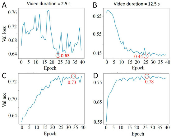 Figure 5. Comparison of different video lengths on CNNFA learning curves. (A) Lost function of 2.5 s video; (B) Lost function of 12.5 s video; (C) Validation accuracy of 2.5 s video; (D) Validation accuracy of 12.5 s video. Minimum lost function values and maximum validation accuracy values are circled in red.