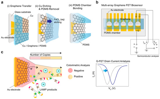 Schematic diagram and functional concept of the graphene field-effect transistor (G-FET) biosensor. (a) Chemical vapor deposition-grown graphene transfer accomplished using copper (Cu) as a sacrificial layer and polydimethylsiloxane (PDMS) as a supportive layer. (b) Design of the multi-electrode array featuring a graphene channel connecting the drain/source contacts, gate, and PDMS chamber. (c) Dual-mode monitoring illustrating the detection of amplicons through loop-mediated isothermal amplification (LAMP) via pH changes.