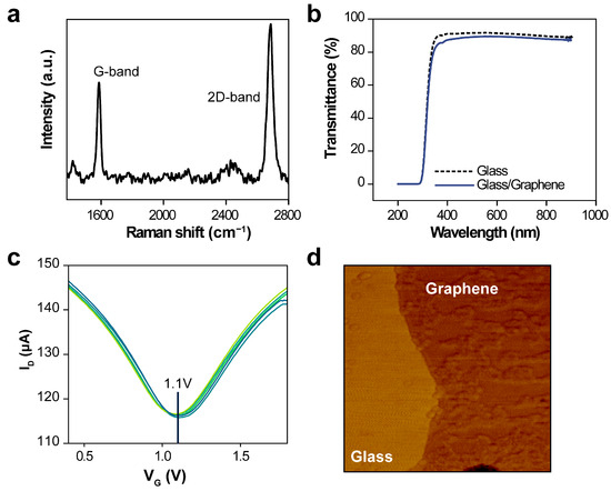 Detailed analysis of the transferred graphene sheet. (a) Raman spectra of the graphene sheet transferred to the multi-electrode array. (b) Ultraviolet–visible spectroscopy transmittance before and after transferring a single-layer graphene film to the glass substrate. (c) Transfer curves for the five-electrode array graphene field-effect transistor, with 1× phosphate buffer solution within the polydimethylsiloxane chambers. (d) Atomic force micrograph of the transferred graphene sheet.