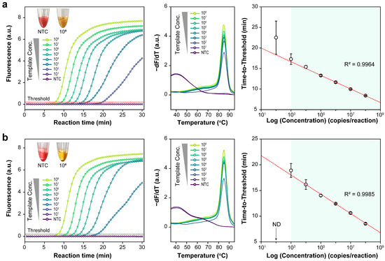 Figure 3 illustrates the amplification and melting curves of a series of targets, serially diluted 10×, using real-time fluorescence monitoring. The thresholds in the amplification curves were automatically determined by the software. Standard curves for the LAMP assay display plot of log concentration vs. time to threshold. Each target showed a strong linear connection (R2 > 0.99) over three repetitions., ranging from 1.48 × 108 to 1.48 × 103. These results suggest that the detection limit for the optimized LAMP reaction was approximately 1.48 × 103.