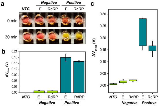 After the LAMP reactions were carried out with specifically optimized primer sets that targeted the E and RdRP genes of SARS-CoV-2, chambers with a 50 mm diameter comprising PDMS were introduced with a non-template control (NTC), two negative assays, and two positive assays at a concentration of 105 copies per reaction. The LAMP reaction was monitored both visually and using a semiconductor parameter analyzer. During the assay, the temperature of the G-FET biosensor was consistently maintained at 65 °C using a thermal hot chuck. After 30 min, the final amplified LAMP assay product was evaluated both colorimetrically and electrically through measuring the G-FET ID, as depicted in Figure 4a,b. For the colorimetric detection, an orange hue signified a positive reaction, whereas a neutral pink color denoted a negative reaction (Figure 4a). The ID was assessed by sweeping VG from −0.4 V to 1.6 V in increments of 0.01 V, with VD held constant at 0.4 V (Figure 4b). Positive LAMP amplification led to a gradual reduction in the pH of the mixture. As a result of this pH decrease, the VDirac of the E and RdRP genes shifted positively by 0.18 V (standard deviation (SD), ±0.018 V; n = 3) and 0.16 V (SD, ±0.003 V; n = 3), respectively. In comparison, the VDirac of the negative reactions shifted only by 0.01 V (E gene: SD, ±0.0016 V; n = 3, and RdRP gene: SD, ±0.0007 V; n = 3).