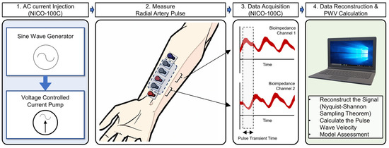 Schematic for measuring radial artery pulse using bioimpedance and the PWV measurement process.