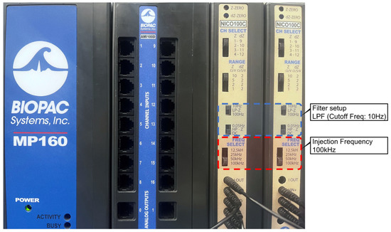 For the hardware setup, we utilized the BIOPAC MP160 Data Acquisition and Analysis system, along with two NICO-100C devices [24]. The MP160 was employed for data acquisition and analysis, while the two NICO-100C devices were used for current injection and pulse measurement. Only one of the NICO-100C devices was responsible for current injection, and the second one was connected solely to the voltage measurement terminal [19]. In general, higher frequencies can result in better current conduction through the body’s tissues. Taking this into consideration, we opted to use the highest injection frequency available, which is 100 kHz [24,25,26]. A low-pass filter (LPF) with a cutoff frequency of 10 Hz was also utilized for filtering to eliminate high-frequency noise from the recorded signals. The specific illustration of the hardware configuration is illustrated in Figure 2.