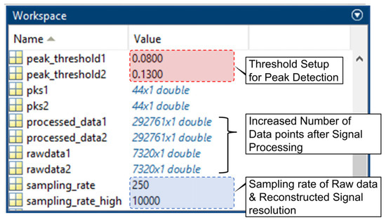 The results of the signal reconstruction in the MATLAB Workspace showed a change in frequency and an increased number of samples (Figure 4).
