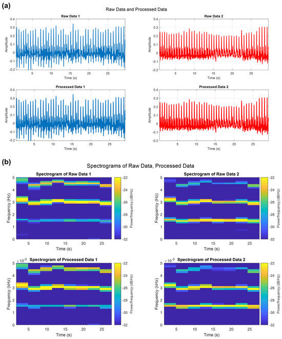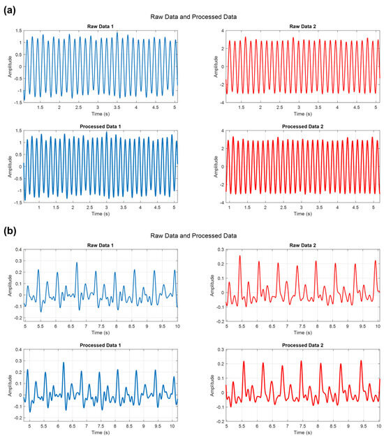 In addition to utilizing the MATLAB Workspace, the confirmation of signal reconstruction can also be achieved through signal morphology and frequency analysis (Figure 5a,b). In Figure 5a, for this experiment, time is represented on the X-axis, while the Y-axis displays the amplitude of the signal, enabling a direct comparison of the raw and processed signal waveforms. By visually examining the similarity of the original signal and the processed data on the time axis, we could see qualitatively that the signals were similar after the signal reconstruction process. Furthermore, the frequency domain analysis could be used to assess the quality of the signal reconstruction. By comparing the frequency components at the same time intervals, we could further validate the accuracy of the reconstructed signal. Figure 5b qualitatively illustrates the similarity between the raw data and the post-processed data in the frequency domain. Both signals exhibited similar frequency components within the typical heart rate range of 1 to 5 Hz, along with their respective second and third harmonic components [37,38,39]. The consistency of these frequency components confirms the successful reconstruction of the signal, adding further confidence to the reliability of the results. Restored images for other frequencies can be found in Supplementary Figures S2–S4.
