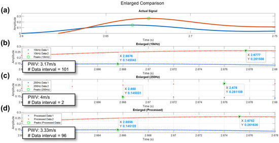 Figure 8a provides an example of the selected signal pairs sampled at 10 kHz, and Figure 8b shows an enlarged version of Figure 8a. In Figure 8c, the enlarged, down-selected 250 Hz signal is depicted, and it can be observed that while the peak points were accurately detected, the data points between the two peak points are limited to only one, indicating a low resolution. However, in Figure 8d, not only have both peak points been successfully identified but also, there are 96 data points between the peaks, which is comparable to the existing method shown in Figure 8b. This demonstrates that the proposed method achieves nearly identical resolution compared to the conventional method. Furthermore, considering that the number of data points between intervals did not simply increase by a factor of 40 (10 kHz divided by 250 Hz), which would have been the case if it were a simple interpolation, but rather by a more complex ratio, it became evident that this was not a result of simple interpolation but rather of the signal having been resampled and reconstructed. This is because the digitized signal and the restored signal had different peak values at different time instances. In fact, when looking at the PTT intervals, it can be seen that the restored signal is more similar to the PTT of the originally recorded 10 kHz signal. The method of peak detection in the restored signal is detailed in Supplementary Figure S5.