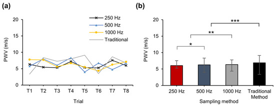 Each method was tested with eight trials across three sampling frequencies and the traditional 10 KHz sampling, and the results are presented in Figure 9a. According to a published paper that conducted a comprehensive study of 780 healthy individuals, focusing on PWV, it has been revealed that PWV values exhibit a substantial association with age. In the current study context, the anticipated PWV range for ages 30–39 was within the 4.08 m/s to 8.26 m/s bracket, while the total range from the whole participation was 3.12 m/s to 13.4 m/s [45]. Therefore, in this study, we evaluated the effectiveness of our approach based on whether it fell within the PWV range mentioned above. As shown in Figure 9b, the proposed method yielded average PWV values of 6.04 m/s at 250 Hz, 6.27 m/s at 500 Hz, and 6.35 m/s at 1000 Hz, and the conventional method at the 10 kHz sampling rate resulted in 6.87 m/s. These values suggest that the proposed method aligns with the standards of healthy men in their 30s from previous studies. The average PWV for each method showed a comparable accuracy, and the maximum deviation in the average PWV over the eight trials for each method demonstrated comparable accuracy to the conventional method.