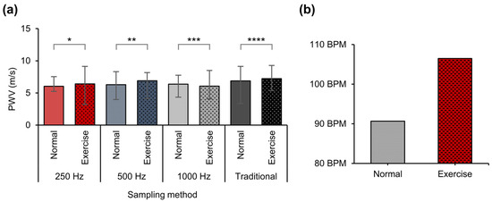 In Table 1 and Figure 10a, we have compared the pre- and post-exercise PWV measurements as a function of sampling frequency using the same method to observe what happened to the PWV values with exercise. Considering the fact that PWV is a variable associated with arterial stiffness and that the pressure did not change, it is not surprising that there were no significant changes in the PWV immediately after biking [46]. The participants rode a bicycle at maximum speed for about 10 s. The measurements after exercise were also repeated eight times for each method. As noted, the average PWV value after exercise for the 250 Hz case was 6.41 m/s; for 500 Hz, it was 6.89 m/s; for 1000 Hz, it was 6.06 m/s; and finally, for the conventional 10 kHz, it appeared as 7.23 m/s, showing that there were no significant differences between these and the PWV values before exercise. Additionally, a comparison of heart rates before and after exercise was conducted to verify whether artery pulse signal measurements were performed correctly. Before exercise, the average rate was 91.3 BPM (Beats Per Minute), and after exercise, it was 106.5 BPM. This comparison indicates that, although the PWV did not change significantly, the exercise heart rates did increase and were within the normal range for light exercise, as anticipated [46]. This also aligns with previous research that has suggested that there is no significant relationship between heart rate and PWV [47] and that the proposed method can be applied reliably with variations in heart rate. To cross-verify that the experimental method did not affect blood pressure, blood pressure and heart rate were measured using Finapres® NOVA before and after the bicycle was ridden (Supplementary Figure S7).