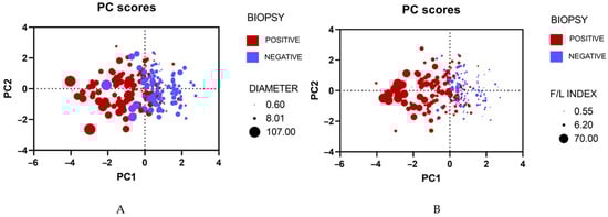 (A) Principal Component Analysis of biopsies and tumor diameter; (B) Principal Component Analysis of biopsies and F/L index.