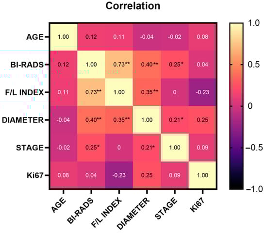 Our results demonstrated that the F/L index had a positive and significant correlation between BI-RADS classification (r = 0.73) and tumor diameter (r = 0.35); similarly, BI-RADS classification was positively and significantly correlated with tumor diameter (r = 0.40) and clinical stage (r = 0.25). At the same time, clinical stage and tumor diameter showed a positive and significant correlation (r = 0.21) (Figure 5).