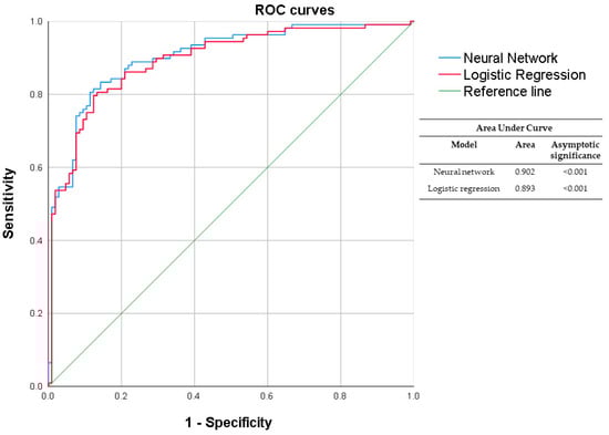 ROC curve comparing neural network versus logistic regression. The neural network performs 0.902 of AUC with a p < 0.001; Logistic regression shows an AUC of 0.893 and a p < 0.001.