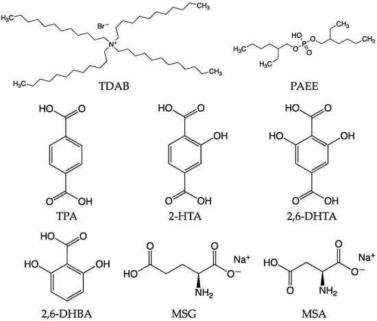 The structural formula of TDAB, PAEE, TPA, 2-HTA, 2,6-DHTA, 2,6-DHBA, MSG, and MSA.
