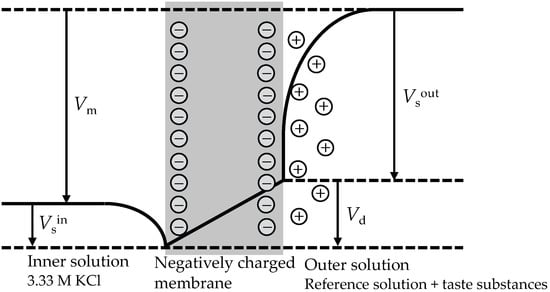 In a broad sense, the taste sensor are ion-selective electrodes fabricated with lipid/polymer membranes based on ion exchangers []. To elucidate the response mechanism of the taste sensor, the potential profile of a lipid/polymer membrane containing negatively charged lipid, plasticizer, and PVC is illustrated in Figure 4. The negatively charged lipid/polymer membrane acts as a barrier between two KCl solutions. When the concentrations of the solutions on either side of the membrane are different, the membrane potential difference appears between the outer and inner solutions.