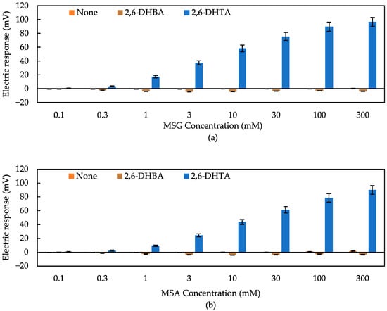 First, we employed 2,6-DHBA and 2,6-DHTA as modifies to detect umami. These two materials were utilized to detect non-charged bitterness substances in previous studies [,,,]. In contrast to the structure of 2,6-DHBA, which features only one carboxyl group on the benzene ring, 2,6-DHTA contains two carboxyl groups on the para-position of the benzene ring. Figure 5 presents the response to MSG and MSA solutions with three sensors: the sensor without surface modification, the sensor modified with 2,6-DHBA, and the one with 2,6-DHTA. Mean values and standard deviations were calculated from 12 (4 electrodes × 3 rotations) sets of electrical response values. Comparing the data in Figure 5, it is evident that the taste sensor treated with 2,6-DHTA exhibited a significant response to MSG and MSA, while other sensors were unable to detect them. As the concentration of the umami sample solution increased, the response obtained by the 2,6-DHTA-treated sensor also increased. As shown in Figure 5 (orange bar), the sensor without surface modification showed negligible responses (less than 10 mV) to umami substances. These results indicate that the surface modification method using 0.03 wt% 2,6-DHTA as a modifier is a practical approach for the sensor to detect MSG. Furthermore, it is notable that the response values of the taste sensor treated with 2,6-DHTA to these umami substances were consistently positive, and the values increased according to the MSG concentration. MSG ionized in aqueous solution is electrically negative; hence, the positive response of this sensor cannot be considered to be a simple interaction between the membrane and ionized MSG.