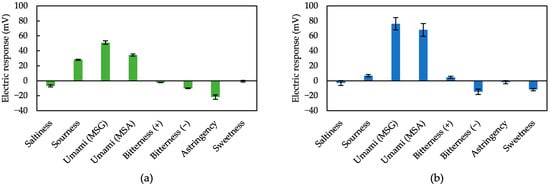 Moreover, the taste sensor treated with 2,6-DHTA showed significant responses to MSG and MSA, while it demonstrated negligible response (less than 10 mV) to saltiness, sourness, bitterness (+), and astringency. Response values for bitterness (−) and sweetness are not necessarily negligible, but they have no impact on identifying umami substances since they exhibited opposite responses to umami substances.