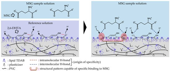 Therefore, we propose a detection mechanism to explain the response to MSG (Figure 8). 2,6-DHTA formed intramolecular H-bonds between its carboxyl groups and hydroxyl groups by dissociating H+ into the reference solution. When the 2,6-DHTA-treated sensors were immersed in the MSG sample solution, intermolecular H-bonds were formed in the two places between the carboxyl groups of 2,6-DHTA and the carboxyl groups of MSG, altering the dissociation of 2,6-DHTA on the lipid/polymer membrane. The two intramolecular H-bonds of 2,6-DHTA were disrupted. The formation and disruption of H-bonds resulted in positive change in the membrane potential associated with taking back H+ to the carboxyl groups of 2,6-DHTA. This process is described as the transition ‘intra- to intermolecular H-bonds’.