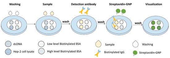 The general principle of the VFA setup is as follows: anti-dsDNA and ANA autoantibodies in a sample bind to their respective capture antigen substrate (dsDNA and nuclear antigens) on a nitrocellulose membrane (NCM) and form an antigen–antibody immuno-complex. Biotinylated anti-human IgG is then added to bind with the anti-dsDNA or ANAs. Finally, streptavidin-conjugated gold nanoparticles (GNP) are added to bind with the anti-IgG, displaying a green colorimetric signal on the NCM. Between each step, the membrane is washed to remove unbound materials and to prevent nonspecific binding, as shown in Figure 1.