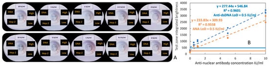 Serial dilution testing using the duplex ANA–αDNA VFA. (A) Image of serial dilutions of the positive control standard (ANA+ and αDNA), ranging from 10 IU/mL to 0 IU/mL, applied to the duplex ANA–αDNA VFA in duplicate (top and bottom). (B) Dose–response curve created using a human anti-dsDNA positive control standard (ANA+ and αDNA+); plotted is the intensity observed in the ANA test zone (Hep-2, orange dashed line) and αDNA test zone (DNA, blue dashed line) versus the actual concentration applied. Colorimetric intensity values were calculated using ImageJ 1.52a. The LoD was determined to be the lowest assayed concentration, the intensity of which exceeded the threshold of the sum of the mean intensity of the non-spiked buffer (0 IU/mL) and 3× its standard deviation.