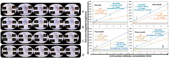 Assessing the storage stability of the duplex ANA–αDNA VFA. Images shown pertain to four sets of standard curves generated using duplex ANA–αDNA VFAs that were stored at room temperature for one day (A), one month (B), two months (C), and three months (D) after the immobilization of the antigen on the NCM, in duplicate. Serially diluted human anti-dsDNA positive control standard (ANA+ and αDNA+) from 10 IU/mL, 5 IU/mL, 1 IU/mL, and 0.5 IU/mL to 0 IU/mL were loaded onto the NCM to construct the standard curves. (E) Plots of serial dilution of the anti-dsDNA positive control standard (ANA+ and αDNA+) under different storage durations. Orange line indicates ANA and blue line indicates αDNA detection. The LoD of the four sets of standard curves was 0.5 IU/mL for ANA and αDNA detection, and there was no significant difference between the storage times among LoDs and linearities as assessed via one-way ANOVA. The LoD was determined to be the lowest assayed concentration, the intensity of which exceeded the threshold of the sum of the mean intensity of the non-spiked sample (0 IU/mL) and 3× its standard deviation.